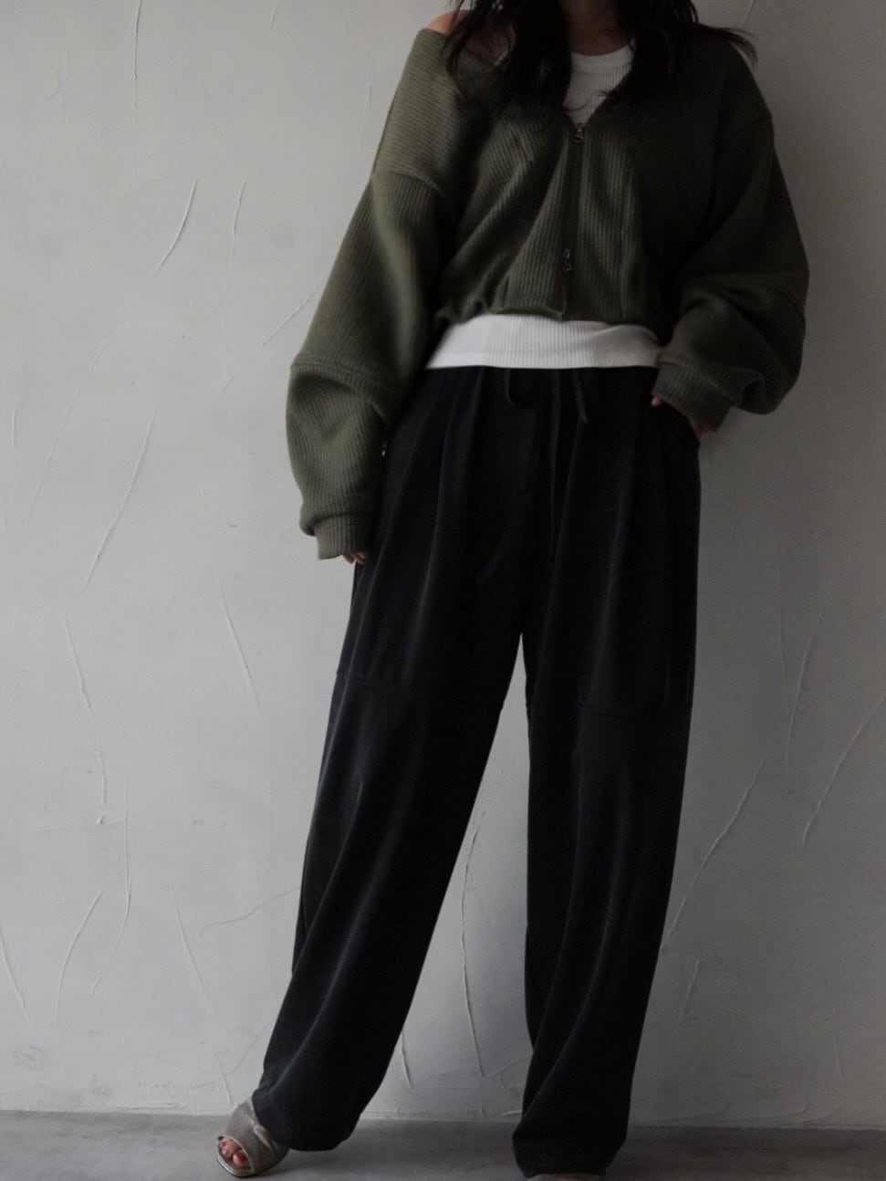 スエード調の質感のサテン生地で作ったリラックスパンツ。